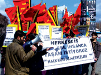 Mücadele Dayanışma” pankartı altında toplanan